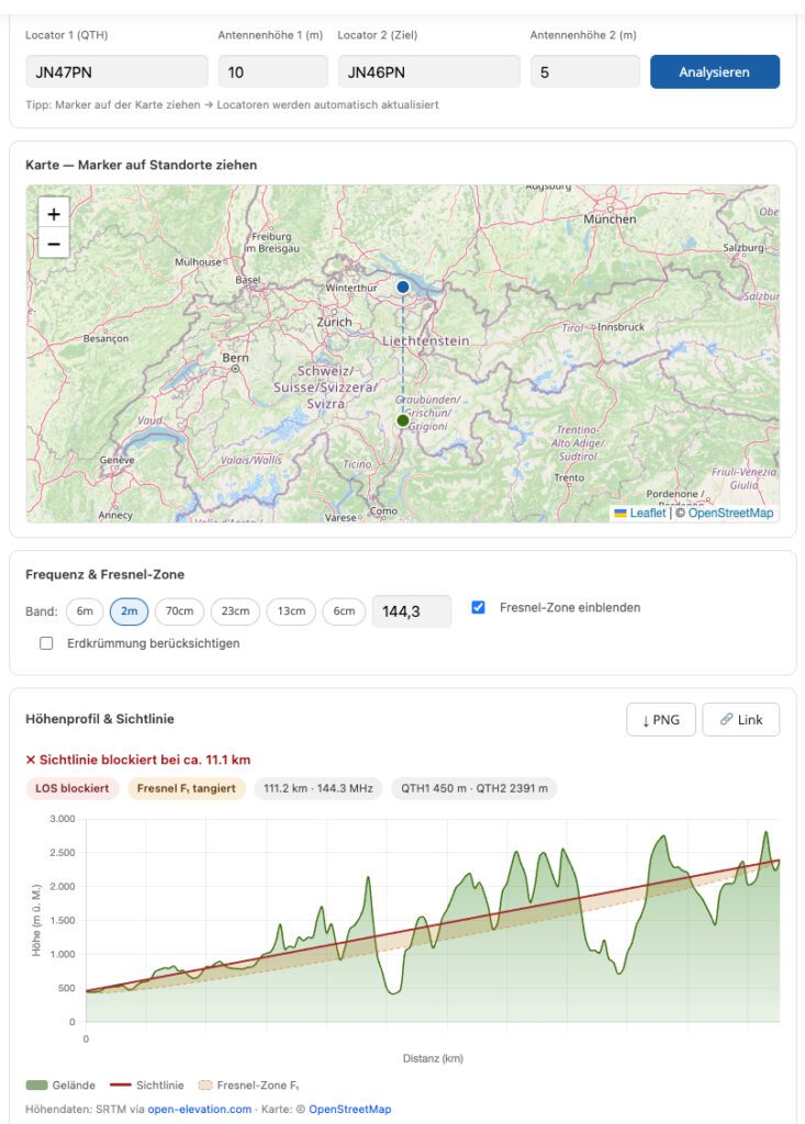- Fresnel-Zonen-Check: Wähle dein Band (von 6m bis 6cm) und prüfe, ob die erste Fresnel-Zone frei von Hindernissen ist.