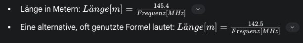 Die Länge des Antennendrahtes bestimmt die Grundresonanzfrequenz. Eine gute Ausgangsbasis für die Berechnung der Länge bieten folgende Formeln, die bereits einen Verkürzungsfaktor berücksichtigen: