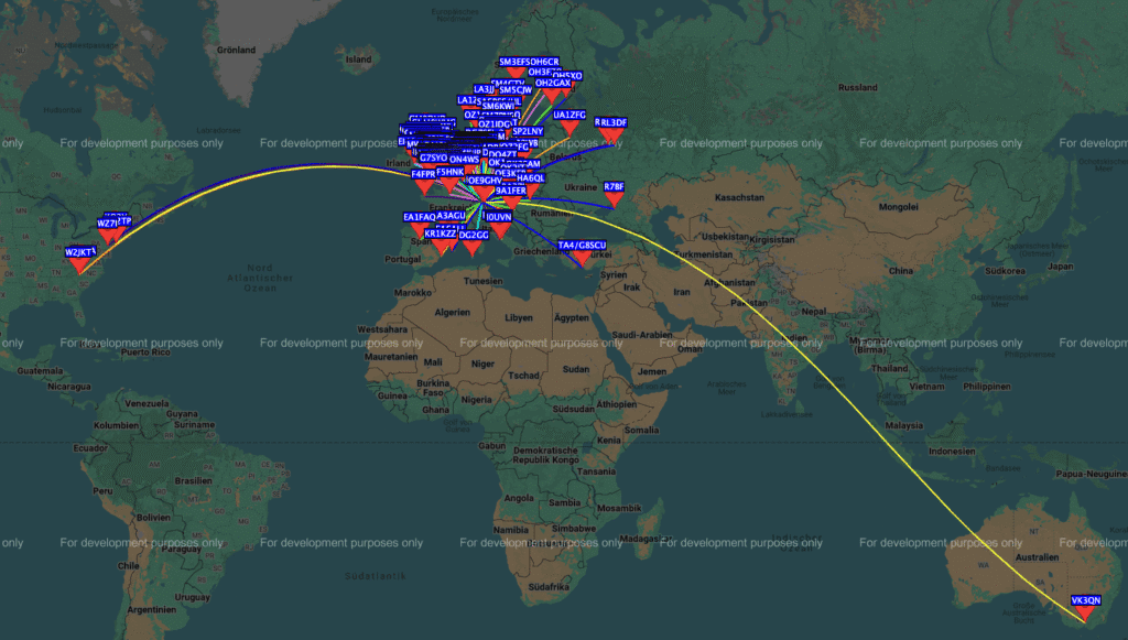 Die wahre Stärke von WSPR liegt in seinem Netzwerk-Aspekt. Jede WSPR-Station, die mit dem Internet verbunden ist, kann ihre Empfangsberichte – sogenannte «Spots» – automatisch in eine zentrale, öffentlich zugängliche Datenbank auf der Webseite WSPRnet.org hochladen. Diese Datenbank aggregiert die Daten von Tausenden von Stationen weltweit und erstellt daraus in Echtzeit eine globale Karte der Funk-Ausbreitungsbedingungen. Auf einen Blick ist ersichtlich, welche Pfade zwischen welchen Kontinenten auf welchen Bändern gerade offen sind.
