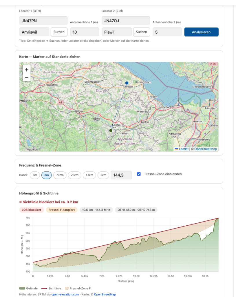 Das Sichtlinien-Tool auf funkwelt.net hat ein praktisches Update erhalten. Wer bisher seinen Standort als Maidenhead-Locator eingeben musste, kann das nun auch ganz einfach über einen Ortsnamen tun – und das war eine Idee von Michi HB9EIY, dem ich an dieser Stelle herzlich danke!