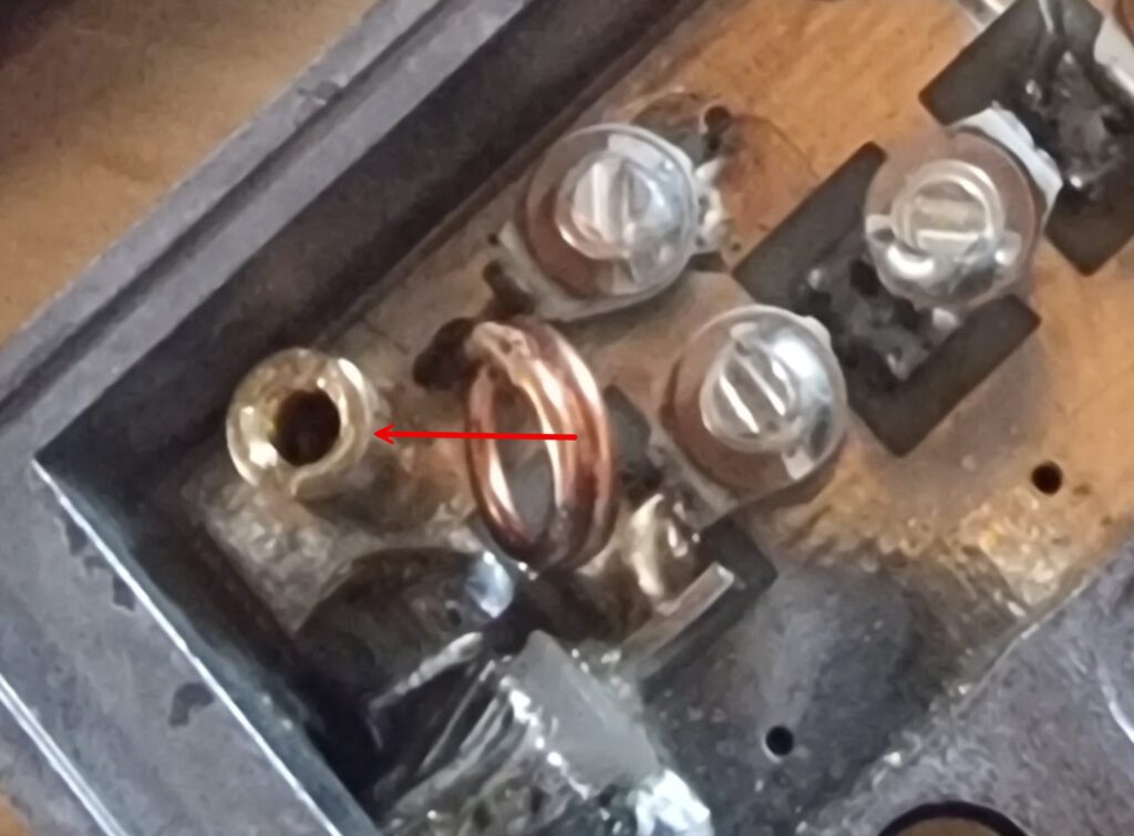 Eine der Kupferspulen im Inneren hatte Kontakt mit einer metallischen Hülse, die zur Befestigung des Gehäusedeckels dient. Dieser ungewollte Kontakt verursachte einen satten Kurzschluss gegen Masse.